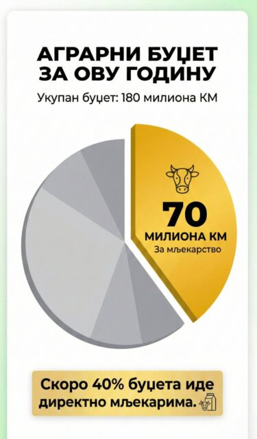 Iz Ministarstva podsjećaju da Agrarni budžet za ovu godinu iznosi 180 miliona KM i da skoro 70 miliona KM, odnosno skoro 40 odsto ovog budžeta ide direktno mljekarima.